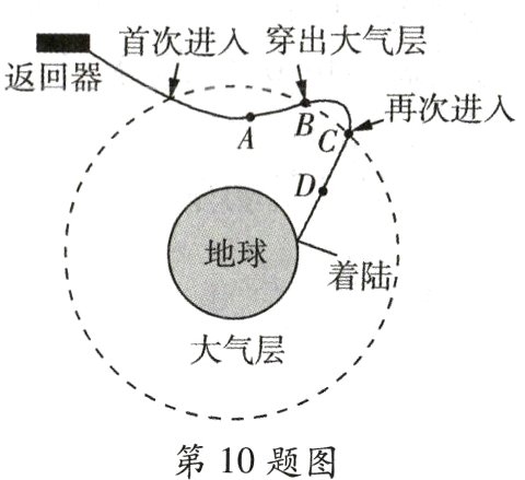 10. 我国已成为世界上第三个实现月球采样返回的国家. 返回器用类似“打水漂”的方式着陆地球,其着陆过程的简化轨迹如图所示. 从A点运动到B点的过程中,返回器的重力势能______(选填“变大”“不变”或“变小”);从B点运动到C点的过程中,返回器的动能______(选填“先变大后变小”“不变”或“先变小后变大”);BC段返回器的机械能______(选填“变大”“不变”或“变小”),从C点运动到D点的过程中,返回器动能的增加量______(选填“大于”“等于”或“小于”)重力势能的减小量.