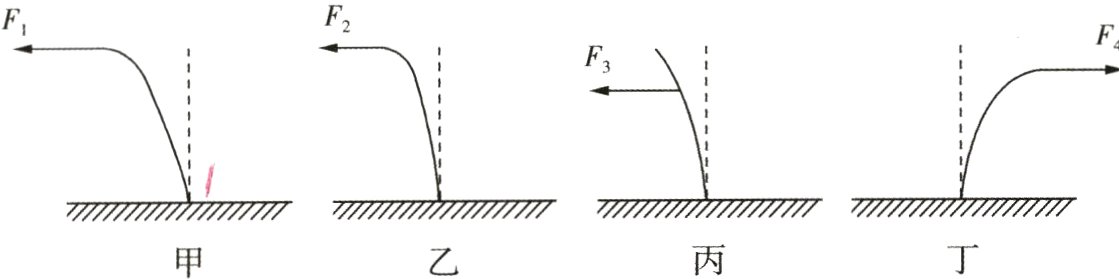 17. 为了探究力的作用效果的影响因素,小明做了如下实验:将一钢条的下端固定,然后分别用不同方向或不同大小的力作用在钢条的不同部位,使其发生如图中甲、乙、丙、丁所示的形变,各力的大小关系为$F_{1}=F_{3}=F_{4}>F_{2}$.