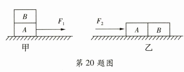 20. 如图甲所示,完全相同的木块A和B叠放在水平桌面上,在10 N水平拉力F1的作用下,A、B一起做匀速直线运动;如图乙所示,将A、B紧靠着放在同一水平桌面上,用水平力F2推A使它们一起做匀速直线运动,则图甲中,A受到桌面的摩擦力是________N,图乙中,水平推力F2是________N.