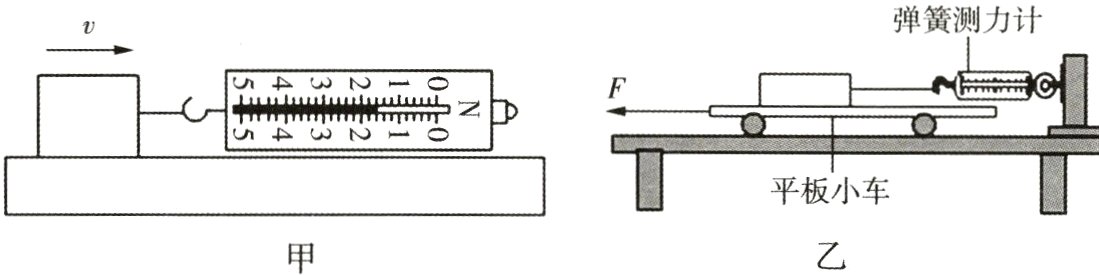 (6) 小明在实验中发现,拉着木块运动时很难控制“匀速”,于是他设计了如图乙所示的装置,将弹簧测力计固定,改为拉动平板小车,当他水平向左拉动平板小车时,木块所受到的摩擦力的方向为____________. 这样改进后,装置的优点是______________________________.