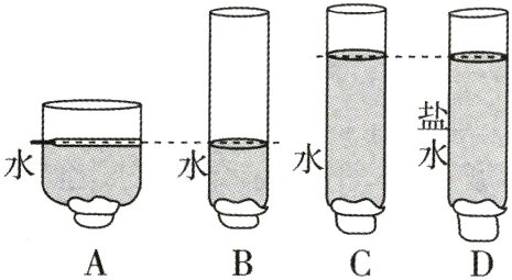 4. 在“探究液体压强与哪些因素有关”的实验中,小安同学取四只瓶嘴大小相同的塑料瓶去底(其中B、C、D三个粗细相同),在瓶嘴上扎上橡皮膜,将它们倒置,如图所示,向A、B、C瓶中装入水,D瓶中装入盐水.