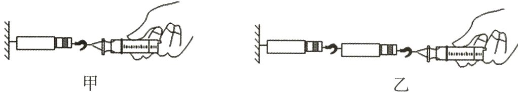 (2)他们在做本实验时发现 $0~10\ N$ 的弹簧测力计损坏了,手边只有两个 $0~5\ N$ 的弹簧测力计,小华就设计了图乙实验,当注射器中的活塞开始滑动时,读出两个测力计的示数,把两个示数之和作为活塞所受的拉力,这个做法________(选填“正确”或“错误”).