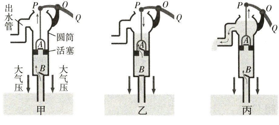 (1)如图甲所示,当在Q点对手柄PQ施加________(选填“向上”或“向下”)的作用力时,圆筒中的活塞向上运动,阀门________(选填“A”或“B”)打开,水在________(选填“大气压”或“水压”)作用下经过阀门流入圆筒.