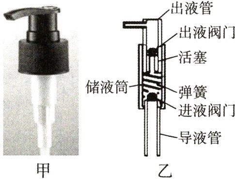 12. 在我们的日常生活中,经常用到按压式洗手液洗手、洗头,那么你知道它的工作原理吗?知道液体是怎么吸上来的吗?原来洗手液瓶中有个如图乙所示的按压式吸液机构. 它的工作原理和活塞式抽水机原理相同,利用活塞的移动来排出储液筒里的空气,造成内外气压差,而使液体在气压作用下上升从出液管里排出管外. 取液时,按压手柄,少量洗手液从出液管溢出;松手后,手柄弹回原位,洗手液又充满储液筒. 当活塞被下压时,出液阀门打开,进液阀门关闭. 弹簧被下压后开始向上回弹,筒内气压为9.1×10⁴ Pa,进液阀门横截面积约为0.55 cm²,则进液的通道所受到的压力是多少?(大气压取1.01×10⁵ Pa)