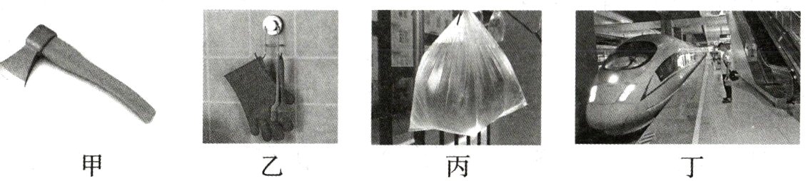 7. 物理知识在生产和生活中有着广泛的应用. 在图甲中,斧头刃磨得很锋利,是为了减小受力面积,增大_______,易于劈开物体. 在图乙中,吸盘式挂钩,是利用了__________的作用;如图丙所示,装有水的塑料袋向外鼓出的原因是____________________. 如图丁所示,乘客在高铁站台要站在白色安全线内,是因为高铁列车进站时带动空气,使靠近列车一侧的空气流速变大,压强变_______,压强差会给乘客带来危险.