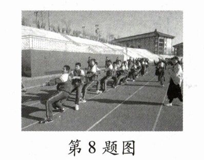 8. 为了丰富校园生活,某校举行了一场班级拔河比赛,如图所示是两班比赛时的场景,双方处于相对静止阶段时,绳子受到__________(选填“平衡力”或“非平衡力”)的作用,比赛过程中运动员的惯性________(选填“变大”“变小”或“不变”). 某班在组队时挑选体重较大的同学参加比赛,这是通过___________的方式增大脚与地面的摩擦力的,同时在比赛时队员应该穿鞋底花纹较________(选填“深”或“浅”)的鞋.