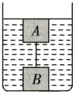 19. 如图所示,体积相同的两个物体A、B用不可伸长的细线系住,放入水中后,A刚好浸没在水中,细线被拉直. 已知A重为6N,B受到的浮力为8N,A、B密度之比为3:5. 则细线对A的拉力为_______N;B对容器底部的压力为_______N.