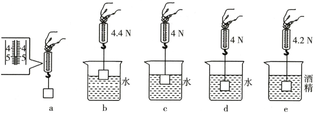 (5)图e中,若烧杯的底面积是25 cm²,物体浸入液体前后,液体对容器底的压强变化了________Pa. (ρ酒精 = 0.8×10³ kg/m³,g取10 N/kg)