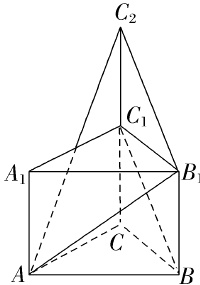 C 设BB$_{1}$ = 1,如图,延长CC$_{1}$至点C$_{2}$,使C$_{1}$C$_{2}$ = CC$_{1}$ = 1,连接B$_{1}$C$_{2}$,则B$_{1}$C$_{2}$//BC$_{1}$,所以∠AB$_{1}$C$_{2}$(或其补角)为异面直线AB$_{1}$与BC$_{1}$所成的角. 连接AC$_{2}$,易知AB$_{1}$ = $\sqrt{3}$,B$_{1}$C$_{2}$ = $\sqrt{3}$,AC$_{2}$ = $\sqrt{6}$,所以AC$_{2}^{2}$ = AB$_{1}^{2}$ + B$_{1}$C$_{2}^{2}$,则∠AB$_{1}$C$_{2}$ = 90°,即异面直线AB$_{1}$与BC$_{1}$所成的角的大小为90°.