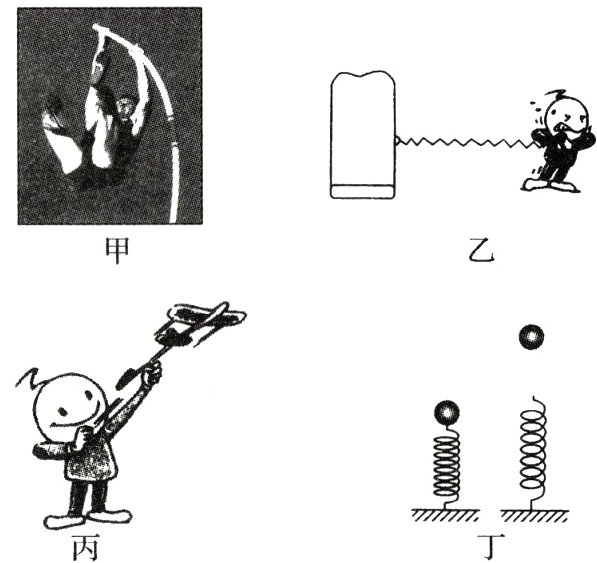 B 甲中杆的弹性势能先增加后减小,乙中弹簧的弹性势能增加,丙中橡皮筋的弹性势能减小,丁中弹簧向上弹起的过程中,弹簧的弹性势能减小,故B正确,A、C、D错误.