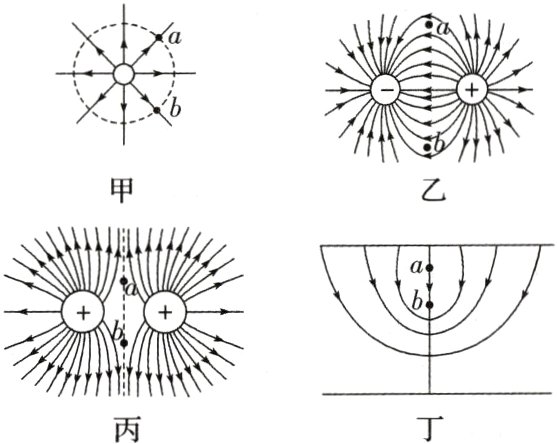 2.C 题甲图中与点电荷等距的a、b两点,电场强度大小相同,方向不相反,故A错误;对乙图,根据电场线的疏密及对称性可判断,a、b两点的电场强度大小相等、方向相同,故B错误;丙图中两等量同种点电荷连线的中垂线上与连线等距的a、b两点,电场强度大小相同,方向相反,故C正确;对丁图,根据电场线的疏密可判断,b点的电场强度大于a点的电场强度,故D错误.