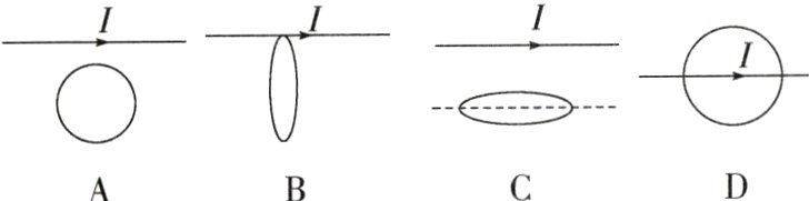 4. 下图中金属圆环均带有绝缘外皮,A项中直导线与圆环在同一平面内,B项中直导线与环面垂直,C项中直导线在圆环水平直径正上方且与直径平行,D项中直导线与圆环接触且与圆环直径重合,当电流增大时,环中有感应电流的是 ( )