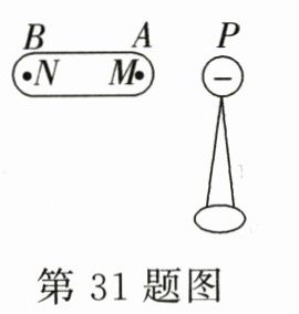 31.AC 由于导体AB缓慢移动,所以导体AB内部可以认为始终处于静电平衡状态,导体内部电场强度始终为零,选项B错误;由于导体AB距P越来越近,所以导体A、B两端积累的感应电荷会越来越多,选项A正确;M点距小球P的距离比N点要近,带负电的小球P在M点产生的电场强度大于在N点产生的电场强度,而导体内部的合电场强度处处为零,那么导体上的感应电荷在M点产生的电场强度就大于在N点产生的电场强度,故选项C正确,选项D错误.