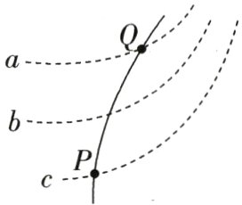 39. 如图所示,虚线$a、b、c$代表电场中的三个等势面,相邻等势面之间的电势差相等,即$U_{ab}=U_{bc}$,实线为一带负电的质点仅在电场力作用下通过该区域时的运动轨迹,$P、Q$是这条轨迹上的两点,据此可知( )