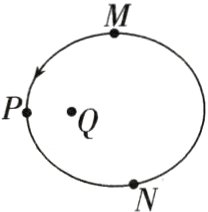 41. 如图所示,带正电的点电荷固定于$Q$点,电子在静电力的作用下,做以$Q$点为焦点的椭圆运动,$M、P、N$为椭圆上的三点,$P$点是轨道上离$Q$点最近的点。电子从$M$点经$P$点到达$N$点的过程中( )