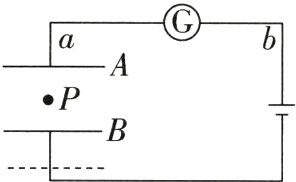 42. 如图所示,平行板电容器$A、B$间有一带电油滴$P$正好静止在极板正中间,现将$B$极板匀速向下移动到虚线位置,其他条件不变。则在$B$极板移动的过程中( )