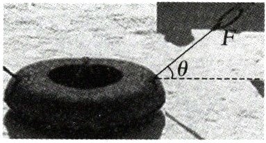 18. 滑雪圈是冬季滑雪场中常见的游乐项目之一,如图所示,人拉雪圈在水平地面上前行. 雪圈质量为$m$,与地面之间的动摩擦因数为$\mu$,绳子对雪圈的拉力为$F$,$F$与水平方向之间的夹角为$\theta$,重力加速度为$g$. 以水平向右为$x$轴正方向,竖直向上为$y$轴正方向建立直角坐标系. 把拉力$F$分解为$x$方向的分量$F_x$和$y$方向的分量$F_y$. 则$F_y$的大小为( )
