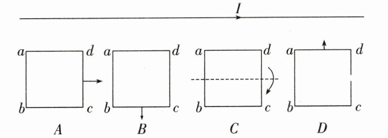 42. 如图所示,正方形线圈处在电流恒定的长直导线形成的磁场中:$A$向右平动,$B$向下平动,$C$绕轴转动($ad$边向外),$D$向上平动($D$线圈有个缺口). 则线圈中能产生感应电流的是 ( )