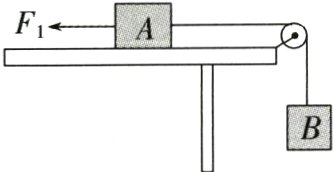 38. 如图所示,物体A放在水平桌面上,通过水平细绳绕过光滑定滑轮悬挂一个重为8 N的物体B,且已知物体A与桌面间的最大静摩擦力为3 N. 要使A静止,需加一水平向左的力F₁,则F₁的取值可以为 ( )