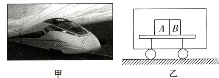 10. 我国的高铁技术在世界处于领先地位,高铁(如图甲所示)在行驶过程中非常平稳,放在桌上的水杯几乎感觉不到晃动. 图乙为高铁车厢示意图,A、B两物块相互接触地放在车厢里的水平桌面上,物块与桌面间的动摩擦因数相同,A的质量比B的质量大,车厢在平直的铁轨上向右做匀速直线运动,A、B相对于桌面始终保持静止,下列说法正确的是( )