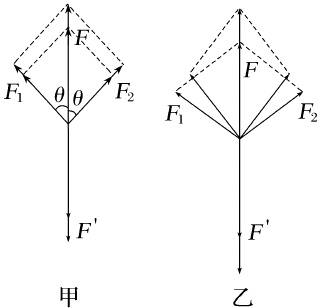 33.BC 手指所受拉力的大小等于绕过动滑轮的绳子两端的拉力$F_{1}$、$F_{2}$的合力$F$的大小.只增加绳的长度,$F_{1}$、$F_{2}$的大小及其夹角不变,则合力$F$不变,A项错误.只增加重物的质量,$F_{1}$、$F_{2}$的大小增大,夹角不变,则合力$F$变大,如图甲所示,B项正确.手指向下移动,$F_{1}$、$F_{2}$大小不变,夹角变小,则合力$F$变大,如图乙所示,C项正确.同理,D项错误.