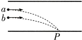 45.一平行板电容器中存在匀强电场,电场沿竖直方向.两个比荷(即粒子的电荷量与质量之比)不同的带电粒子a和b,从电容器边缘同一竖直线上的不同位置(如图)沿相同的水平方向同时射入两平行板之间,经过相同时间两粒子落在电容器下板同一点P上.若不计重力和粒子间的相互作用力,则下列说法正确的是 ( )