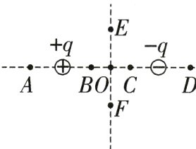 50. 如图所示,在等量异种点电荷形成的电场中,O是两点电荷连线的中点,E、F是两点电荷连线中垂线上相对O对称的两点,B、C和A、D也相对O点对称,则 ( )