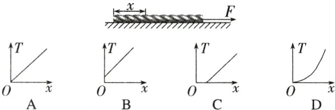 A 设绳子总长为L,单位长度质量为m,对整体分析根据牛顿第二定律有:F = Lma;则对x分析可知:T = xma,联立解得:T = $\frac{F}{L}x$,故可知T与x成正比;且x = 0时,T = 0,故A正确,B、C、D错误.