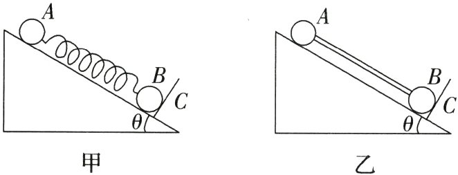 45.如图,A、B两球质量相等,光滑斜面的倾角为θ,图甲中A、B两球用轻弹簧相连,图乙中A、B两球用轻杆相连,系统静止时,挡板C与斜面垂直,弹簧、轻杆均与斜面平行,重力加速度为g,在突然撤去挡板的瞬间( )