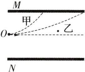 50.两极板M、N水平放置,极板间存在竖直向下的匀强电场,甲、乙两电子以不同的初速度从O点沿水平方向向右射入电场,甲电子落到M板中点,乙电子落到M板右侧边缘,如图所示.下列说法正确的是( )