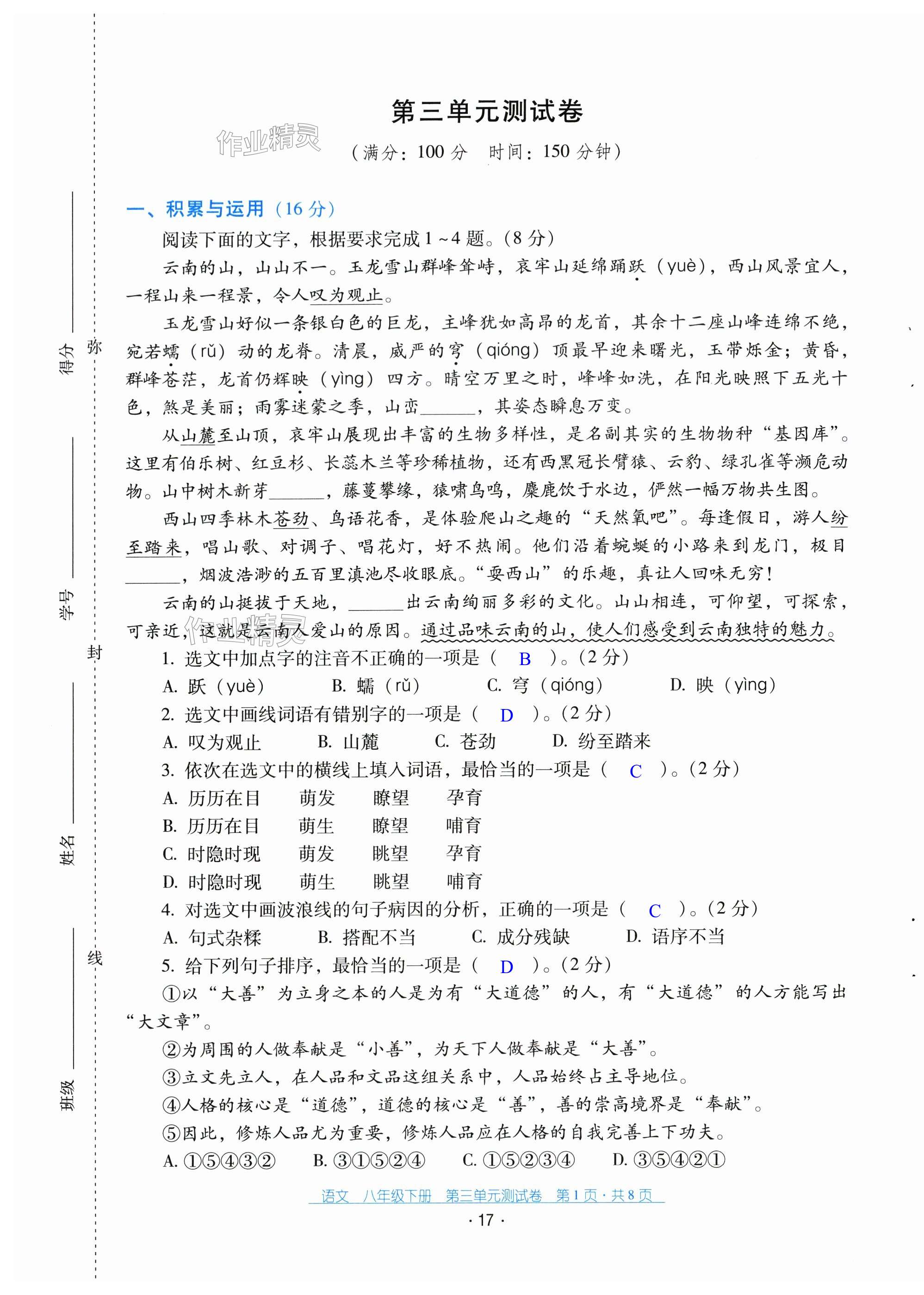 注:目前有些书本章节名称可能整理的还不是很完善,但都是按照顺序排列的,请同学们按照顺序仔细查找。练习册 2025年云南省标准教辅优佳学案配套测试卷八年级语文下册人教版 答案主要是用来给同学们做完题方便对答案用的,请勿直接抄袭。