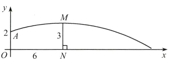 21. (12分)如图,小明站在点 $O$ 处练习发排球,将球从 $O$ 点正上2 m的 $A$ 点处发出,把球看成点,其运行的高度 $y$(m)与运行的水平距离 $x$(m)满足关系式 $y = a(x - h)^{2}+k$. 已知球与 $O$ 点的水平距离 $ON$ 为6 m时,达到最高3 m,球场的边界距 $O$ 点的水平距离为18 m.
