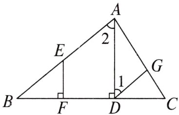 解:因为AD⊥BC,EF⊥BC,所以∠ADB = ∠EFB = 90°,所以AD//EF,所以∠2 + ∠AEF = 180°.因为∠AEF + ∠1 = 180°,所以∠2 = ∠1,所以DG//AB,所以∠CGD = ∠CAB.