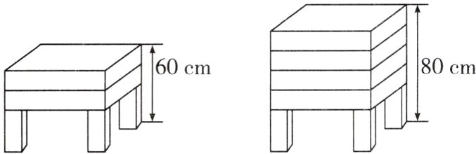 1. 如图,2个塑料凳子叠放在一起的高度为60 cm,4个塑料凳子叠放在一起的高度为80 cm,塑料凳子相同且叠放时均忽略缝隙,则11个塑料凳子叠放在一起时的高度为( )