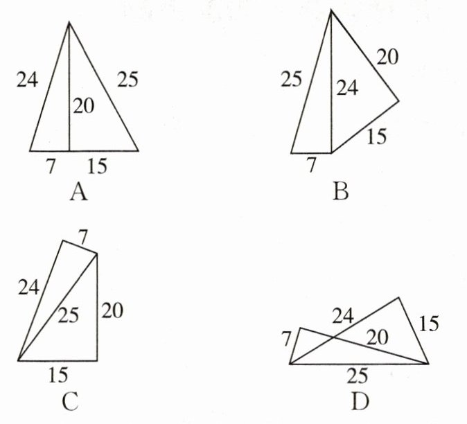 4. 五根小木棒,其长度分别为7,15,20,24,25,现将它们摆成两个直角三角形,下列选项正确的是( )