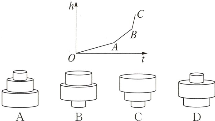7. (2022武汉中考)匀速地向一个容器内注水,最后把容器注满. 在注水过程中,水面高度h随时间t的变化规律如图所示(图中OABC为一折线). 这个容器的形状可能是 ( )
