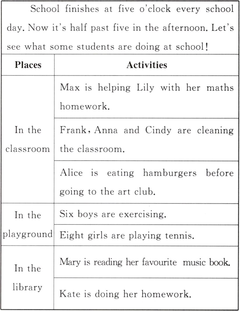 School finishes at five o'clock every school day. Now it's half past five in the afternoon. Let's see what some students are doing at school!