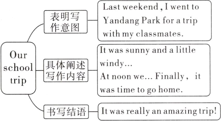 @@One possible version:Our school tripLast weekend, I went to Yandang Park for a trip with my classmates.It was sunny and a little windy. We walked along the lake and took photos in the morning. At noon we took out the food baskets and had a picnic in the park. After lunch, we picked up lots of colourful leaves and explored the park. Finally, it was time to go home.It was really an amazing trip!