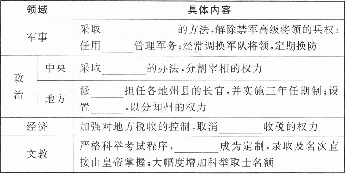 (2)消极:文臣掌兵,导致军队________减弱;政府机构重叠,相互牵制,官吏冗余,人浮于事,办事效率低下;增加了朝廷的________,导致北宋统治出现危机。