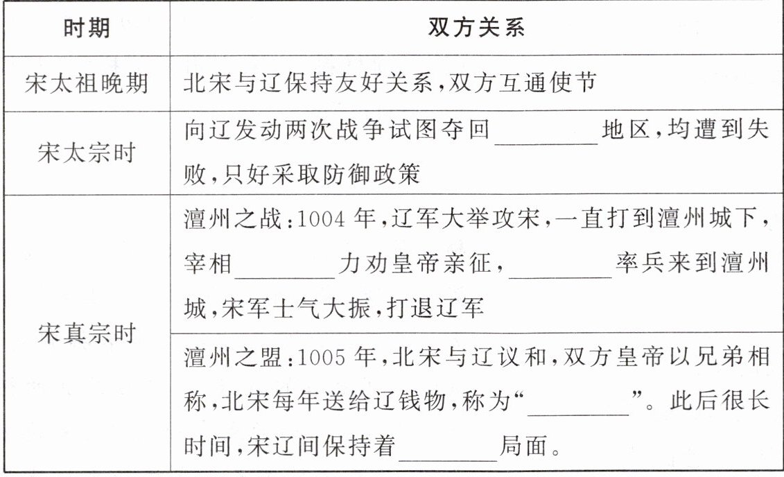 1.事件:澶渊之盟。代价:宋朝给辽钱物,称为“岁币”。2.中原政权和民族政权并立;中原政权和民族政权之间有战有和,和是主流。