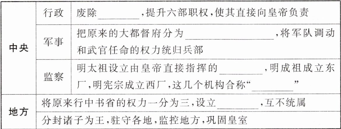 1.废除丞相制度。2.提升六部职权,使其直接向皇帝负责;为分散兵权,明太祖把原来的大都督府分为五军都督府,将军队调动和武官任命的权力统归兵部。3.措施:八股取士。 消极影响:八股文形式呆板,脱离实际,禁锢思想,流弊日益严重。