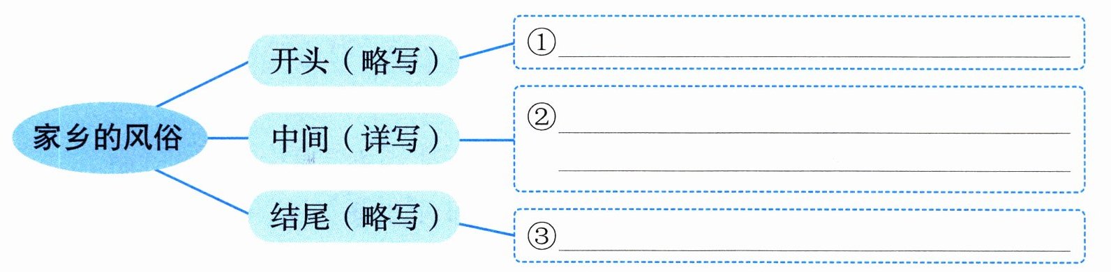 介绍家乡的风俗,写作之前,先查阅资料或问问长辈,深入了解这种风俗的主要特点;写作时要抓住这一特点来写,真正体现家乡风俗的与众不同。请发挥想象,构思文章,把下面的写作提纲补充完整。