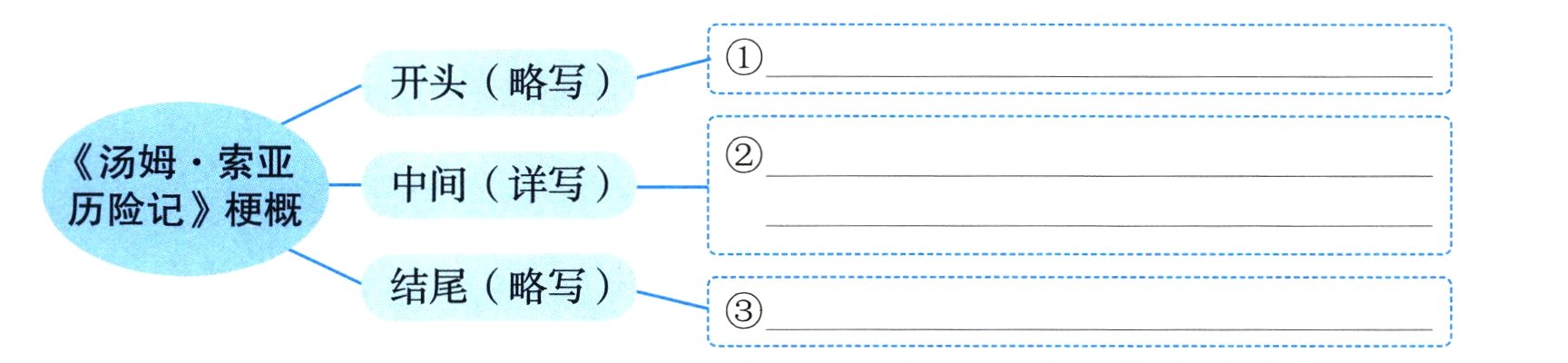这次习作实际是一次缩写,是要把一本书的主要内容以故事梗概的形式缩写成一篇文章。抓住故事重点,详写故事的主要情节,次要的内容略写或不写。请你以“《汤姆·索亚历险记》梗概”为题目,构思文章,把下面的写作提纲补充完整。