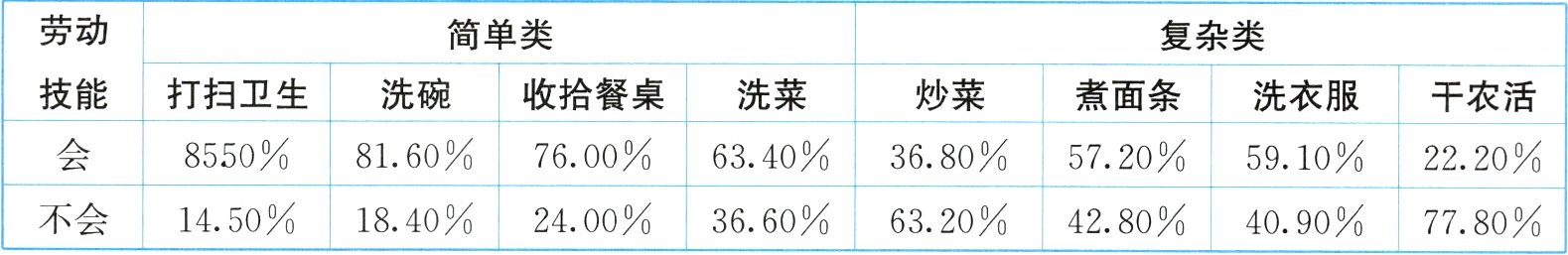 1. 中小学生周末家务劳动时间远低于规定标准;学生在家参加劳动