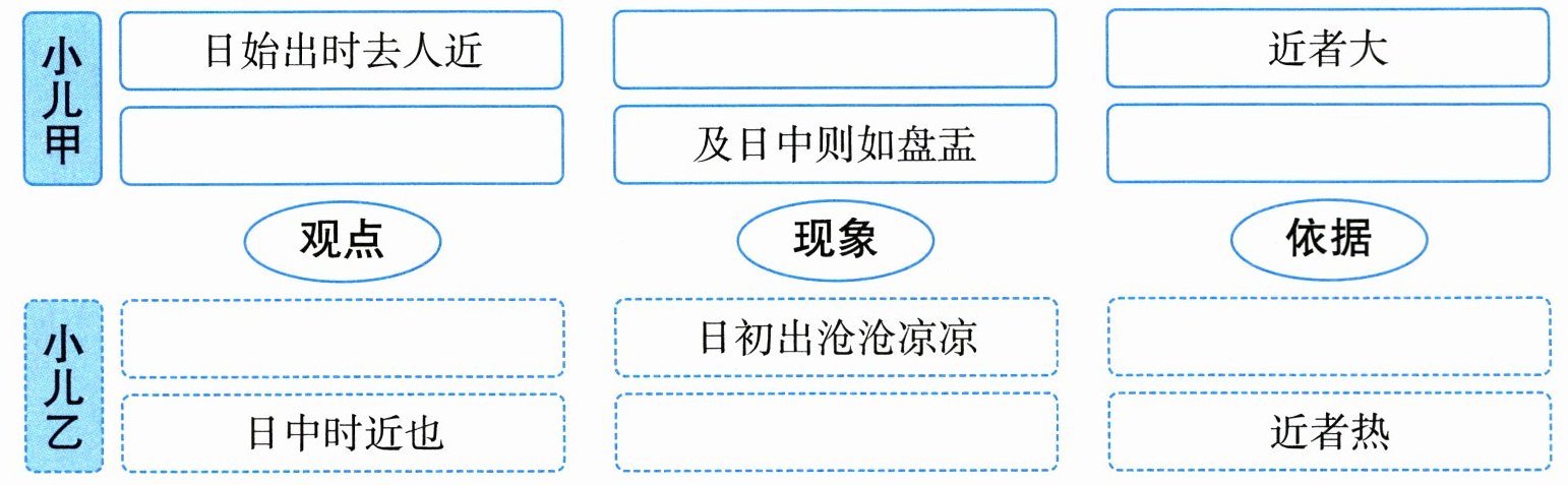 2. (练要素·用事例说明观点)根据提示梳理文中两小儿辩论的观点、现象和依据,并完成练习。