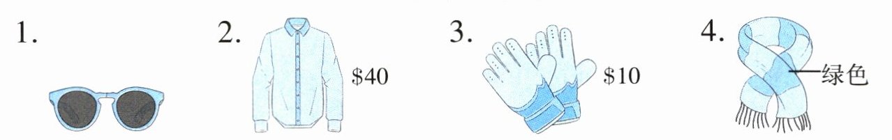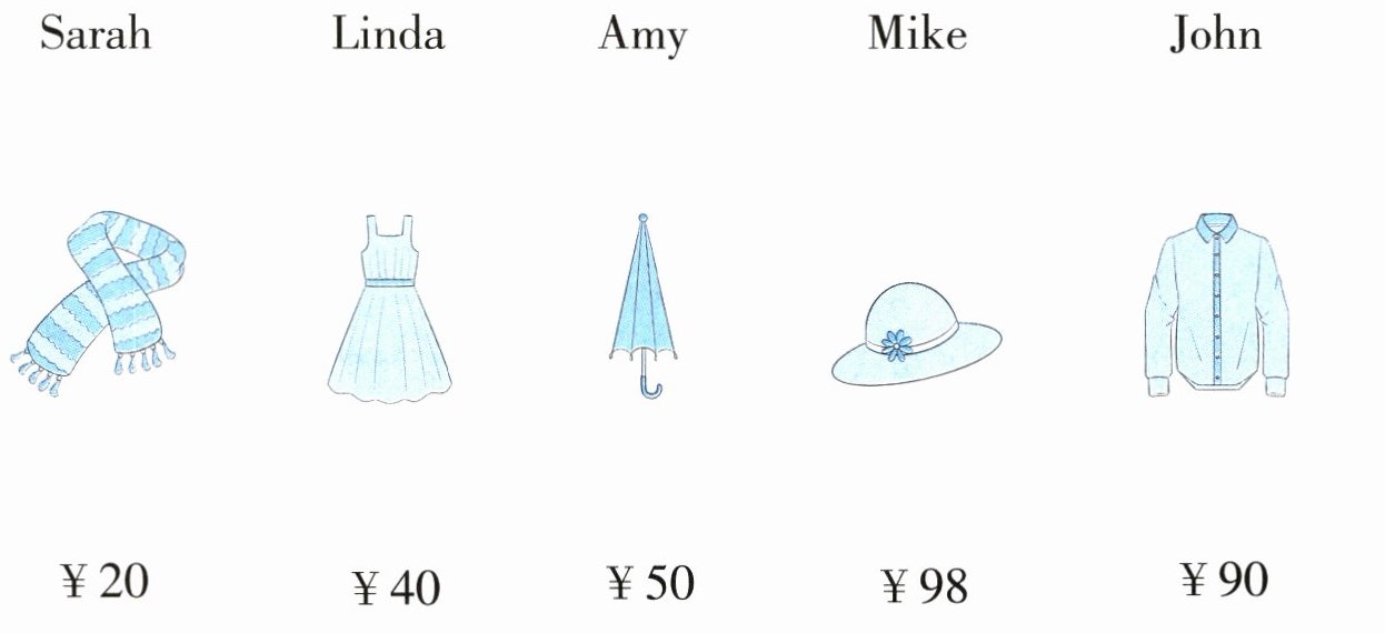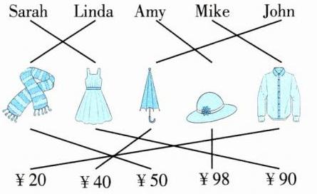 I’m Sarah. I have a pretty dress. It’s ninety yuan. My friend Linda has a long scarf. It’s nice. It’s fifty yuan. Amy has an expensive hat. It’s ninety - eight yuan. Mike has a cheap shirt. It’s twenty yuan. John has a big umbrella. It’s forty yuan.