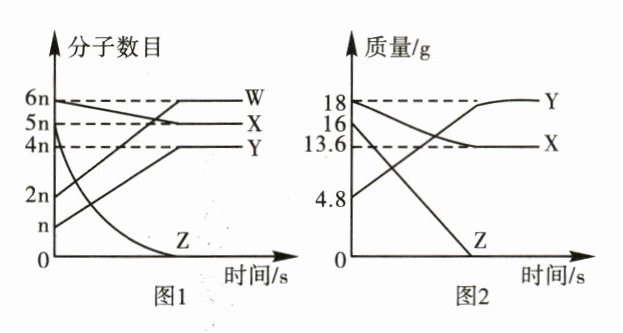 21.(2022·官渡)在一密闭容器中,W、X、Y、Z四种物质在一定条件下发生反应,各物质的分子数目随时间变化情况如图1所示,X、Y、Z、三种物质质量随时间变化情况如图2所示。下列说法不正确的是 ( )