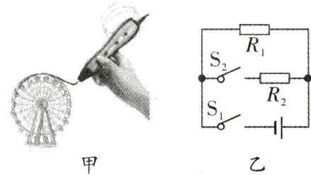 15.(广东中考)如图甲是用某款 3D 打印笔进行立体绘画时的场景。打印笔通电后,笔内电阻丝发热使笔内绘画材料熔化。加热电路简化后如图乙所示,电源电压恒为 6 V,$R_{1}$和$R_{2}$为发热电阻丝。只闭合$S_{1}$时低温挡工作,$S_{1}$、$S_{2}$都闭合时高温挡工作,高温挡和低温挡的功率比为 4:3,$R_{1}=4Ω$,忽略电阻丝阻值随温度变化。求: