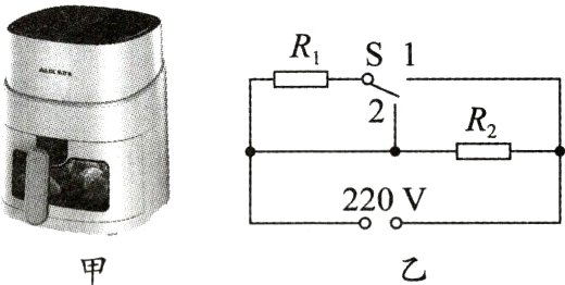 20.(9分)(辽阳中考)图甲是两挡空气炸锅,图乙是其内部简化电路,R1、R2均为发热体,将开关S分别置于1、2两位置时,空气炸锅处于不同的挡位. 已知两挡空气炸锅的高温挡功率为900 W,R2阻值为96.8 Ω. 求:
