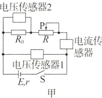 【例4】为了测定电源电动势E、内阻r和定值电阻R₀的阻值,某同学利用传感器设计了图甲所示的电路,闭合开关S,调节滑动变阻器的滑片P向某一方向移动时,通过电压传感器1、电压传感器2和电流传感器测得的数据,用计算机分别描绘了图乙所示的M、N两条U - I直线,请回答下列问题: